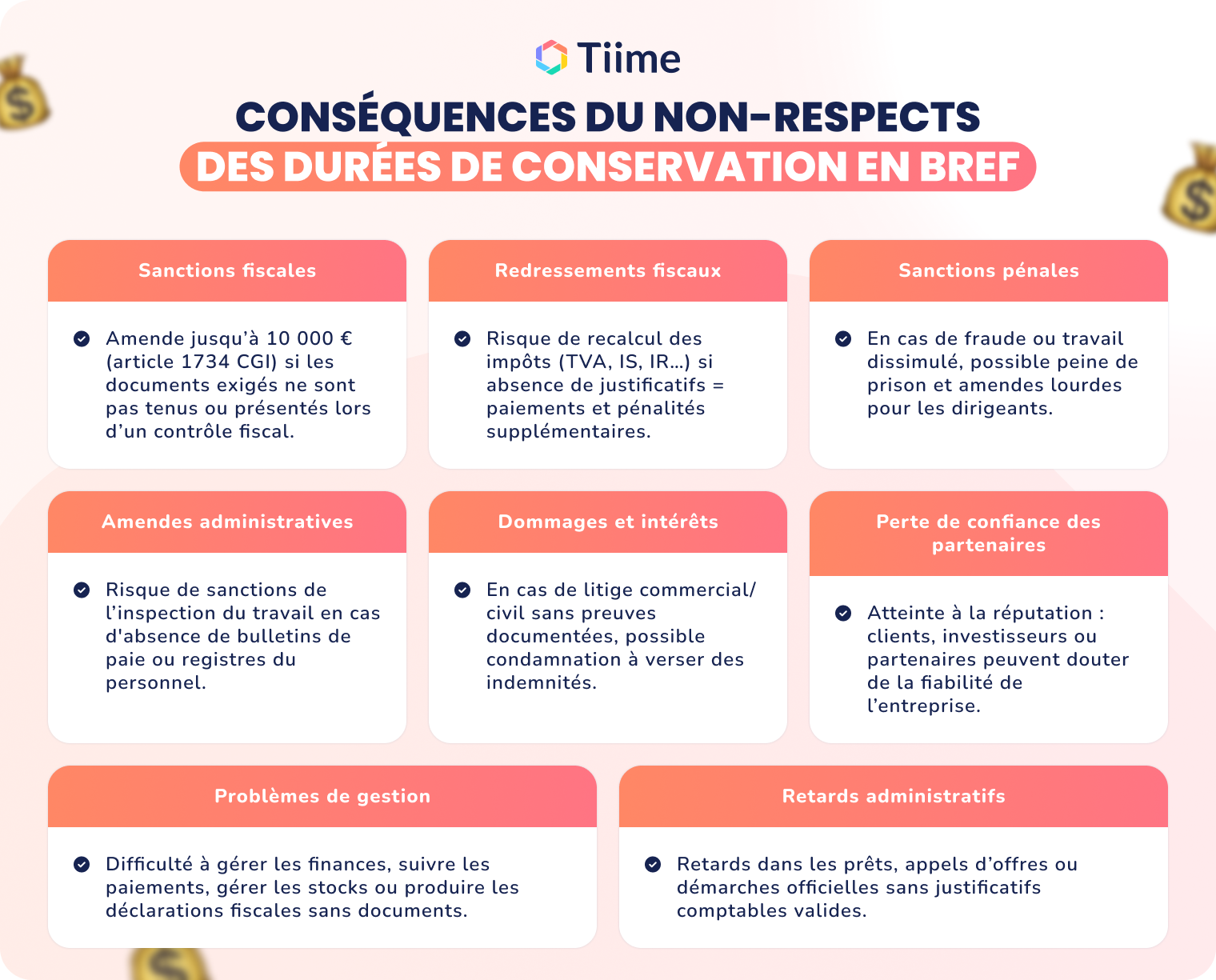 - Sanctions pénales : Dans les cas les plus graves, comme la fraude fiscale ou le travail dissimulé, le non-respect des durées de conservation peut conduire à des sanctions pénales. Cela peut inclure des amendes plus lourdes et des peines de prison pour les dirigeants de l'entreprise.