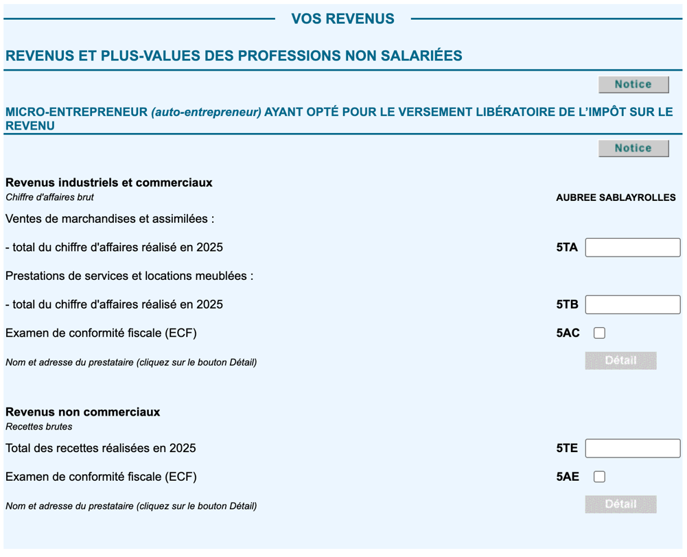 Lorsque le micro-entrepreneur est déclaré en tant que « déclarant 2 », les cases correspondantes deviennent 5UA, 5UB et 5UE. Pour une personne à charge, elles sont respectivement 5VA, 5VB et 5VE.